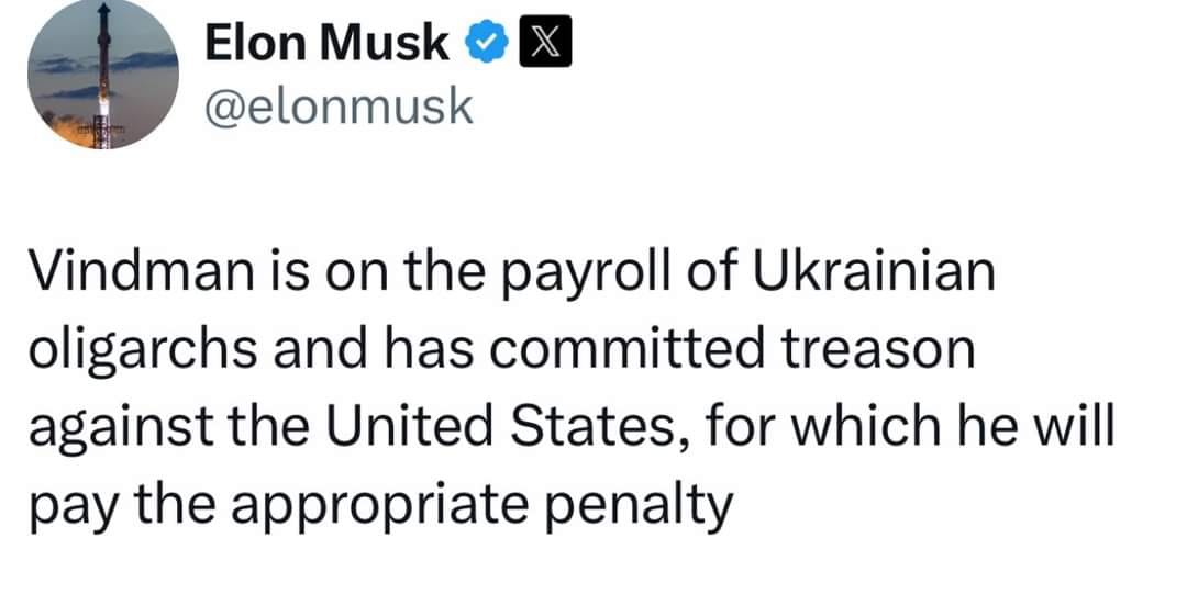 -Elon Musk nói ônng Alexander Vindman nhận tiền của các nhà tài phiệt Ukraine, ông đã phạm tội phản quốc và có thể phải đối mặt với án tử hình. Khi Elon nói hẳn nhiên đã có bằng chứng. Vì nói khơi khơi có thể mất vài chục triệu như chơi.