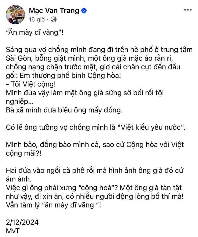Cộng đồng người Việt tại hải ngoại vẫn âm thầm theo dơi giúp đỡ TPB VNCH. Trước đây ḍng Chúa Cứu Thế có chương tŕnh tri ân TPB VNCH. Sau khi bị đánh cho tan đàn xẻ nghé th́ các hội đoàn hải ngoại vẫn âm thầm đi t́m và giúp đỡ họ. Trong nước, các thế hệ con cháu của VNCH và những người có ḷng nhân cũng vẫn tương trợ những người lính của quốc gia họ. Ở đâu ra TPB VNCH đi ăn xin? Ông Trang có đang vẽ ra một câu chuyện không?