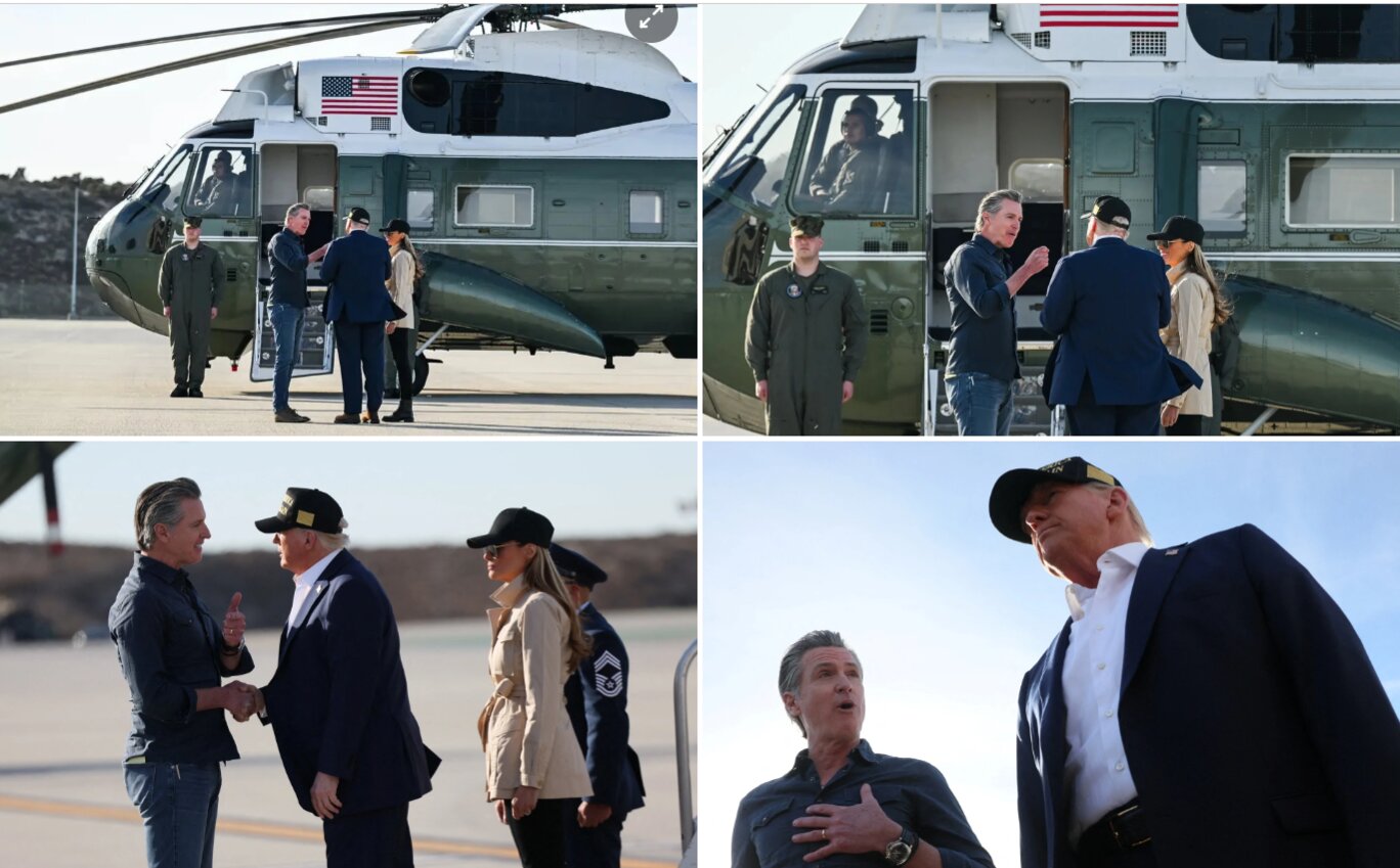 Chuyên cơ Không lực Một hạ cánh xuống Los Angeles vào khoảng 14h55 chiều cùng với một phái đoàn trong đó có đệ nhất phu nhân Melania Trump. Thống đốc California Gavin Newsom chào đón Tổng thống Donald Trump trên đường băng. Cả hai đã có một cuộc thảo luận riêng tư sôi nổi trên đường băng trước khi có cuộc trò chuyện ngắn gọn với báo giới. Ảnh: Reuters, New York Times.