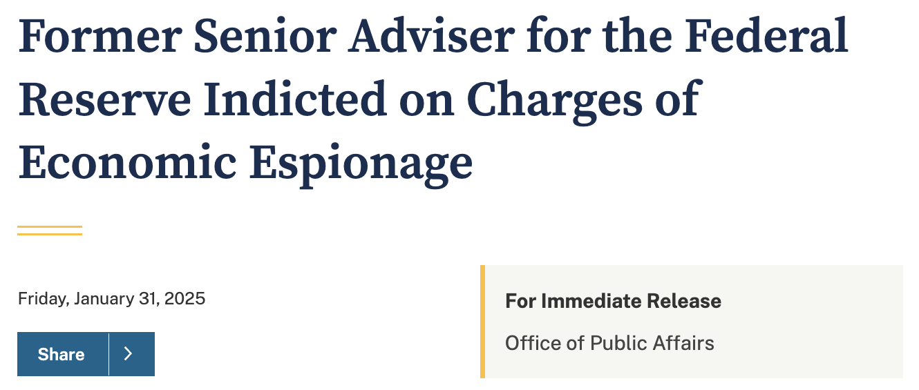 Bản cáo trạng tiếp tục, “Ít nhất là từ năm 2018, Rogers bị cáo buộc đă lợi dụng công việc của ḿnh tại FRB để thu thập thông tin bí mật thương mại liên quan đến các tập dữ liệu kinh tế độc quyền, các cuộc thảo luận về thuế quan nhắm vào Trung Quốc, sổ tóm tắt cho các thống đốc được chỉ định và thông tin nhạy cảm về các cuộc thảo luận của Ủy ban Thị trường Mở Liên bang (FOMC) và các thông báo sắp tới.