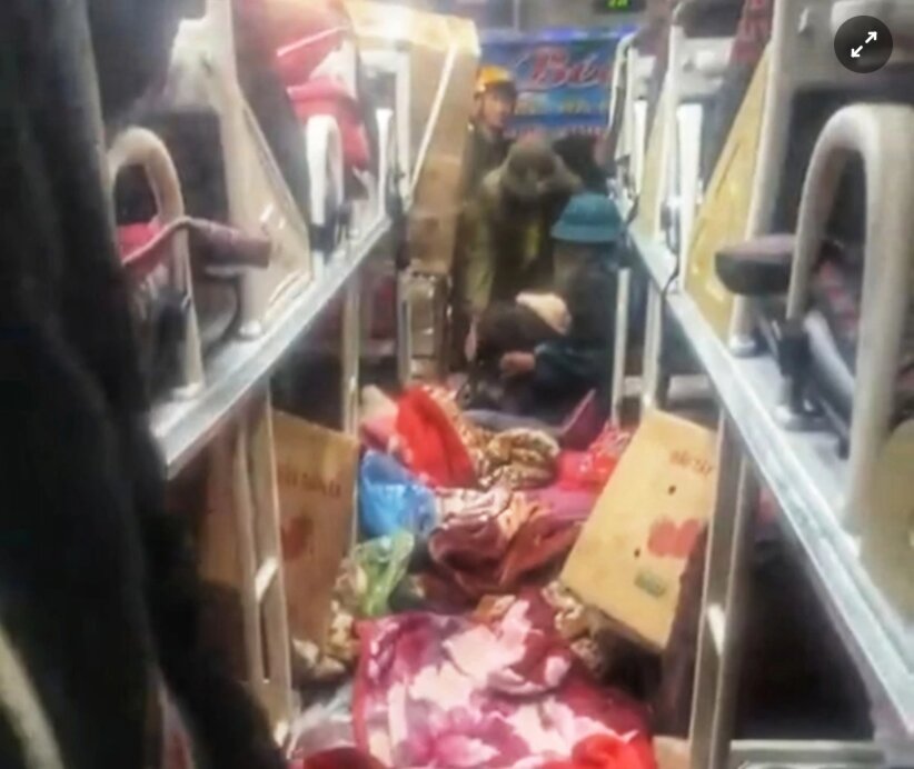 Hiện trường bên trong chiếc xe khách. Ảnh: Sơn Ka.