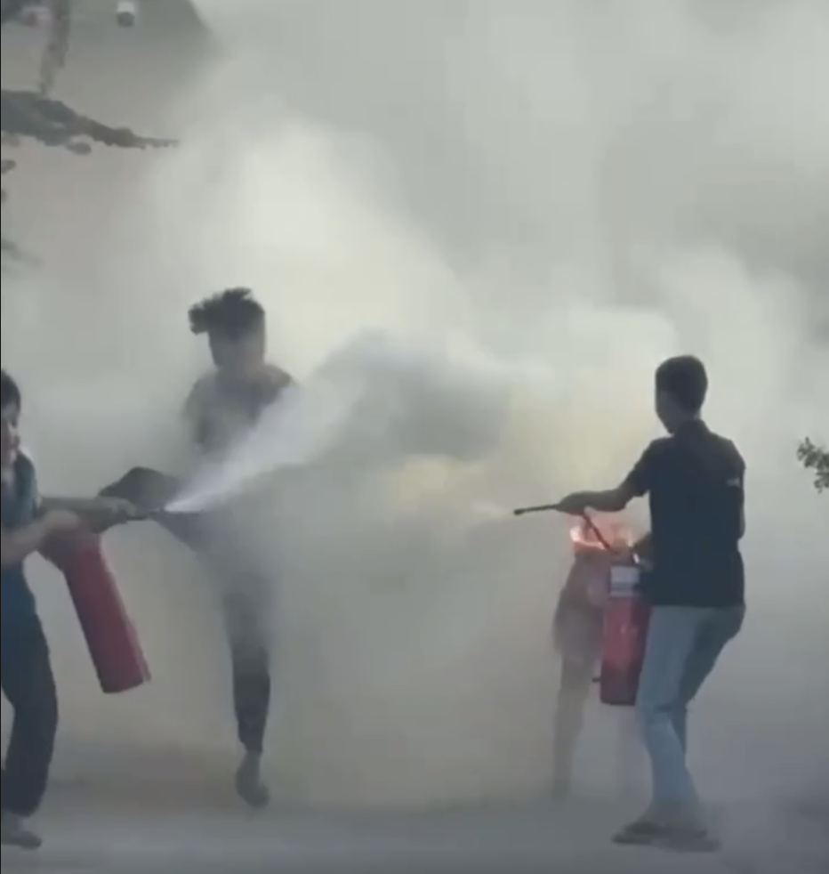 Để có thể cứu nạn nhân, những người dập lửa phải dùng bình chữa cháy xịt trực tiếp vào người nam thanh niên đồng thời tiếp tục dập lửa.