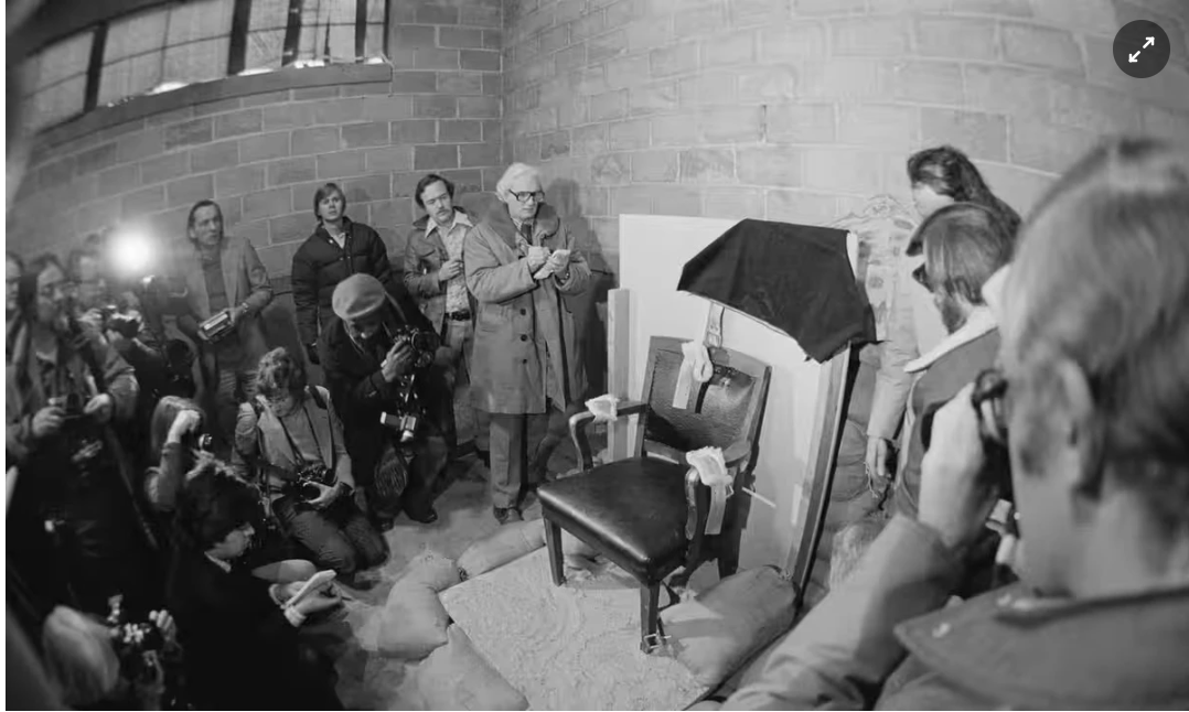 Các phóng viên vây quanh chiếc ghế tử tù Gary Gilmore ngồi khi đối mặt với đội xử bắn ở Utah năm 1977. Ảnh: Guardian.