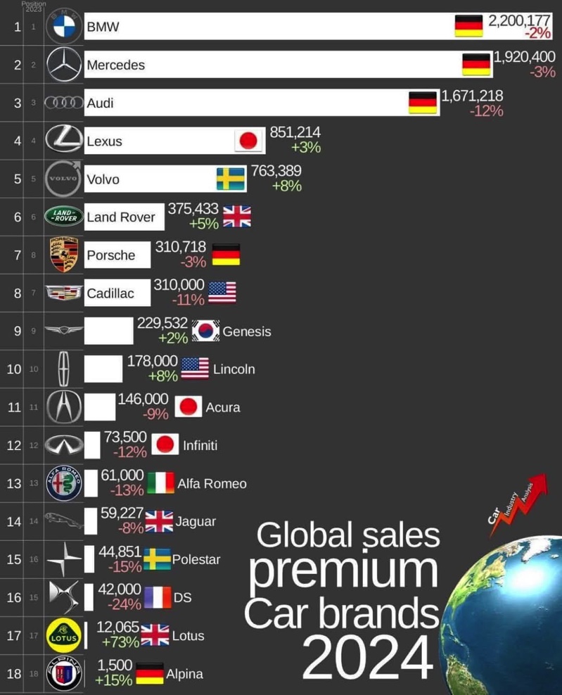 Bảng xếp hạng các thương hiệu xe sang năm 2024 toàn cầu. Có thể nhận thấy bộ ba ông lớn đến từ Đức: BMW, Mercedes và Audi vẫn thống trị nhưng đều giảm doanh số.