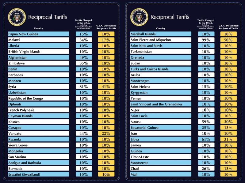 Trump just announced the following Tariffs for the following countries and a 10% baseline tariff on all others not listed.