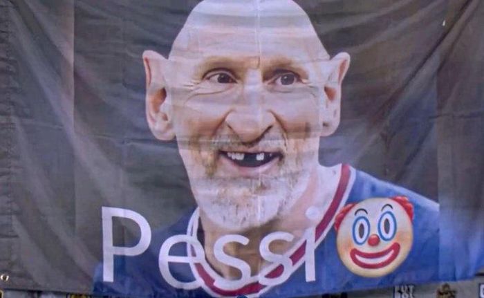 Dưới hình là dòng chữ "Pessi", một cách chơi chữ mỉa mai, kèm theo biểu tượng chú hề càng làm tăng tính xúc phạm. Đáng chú ý, Messi trong ảnh mặc áo PSG, ngụ ý nhạo báng quãng thời gian thi đấu không thành công của anh tại Pháp.