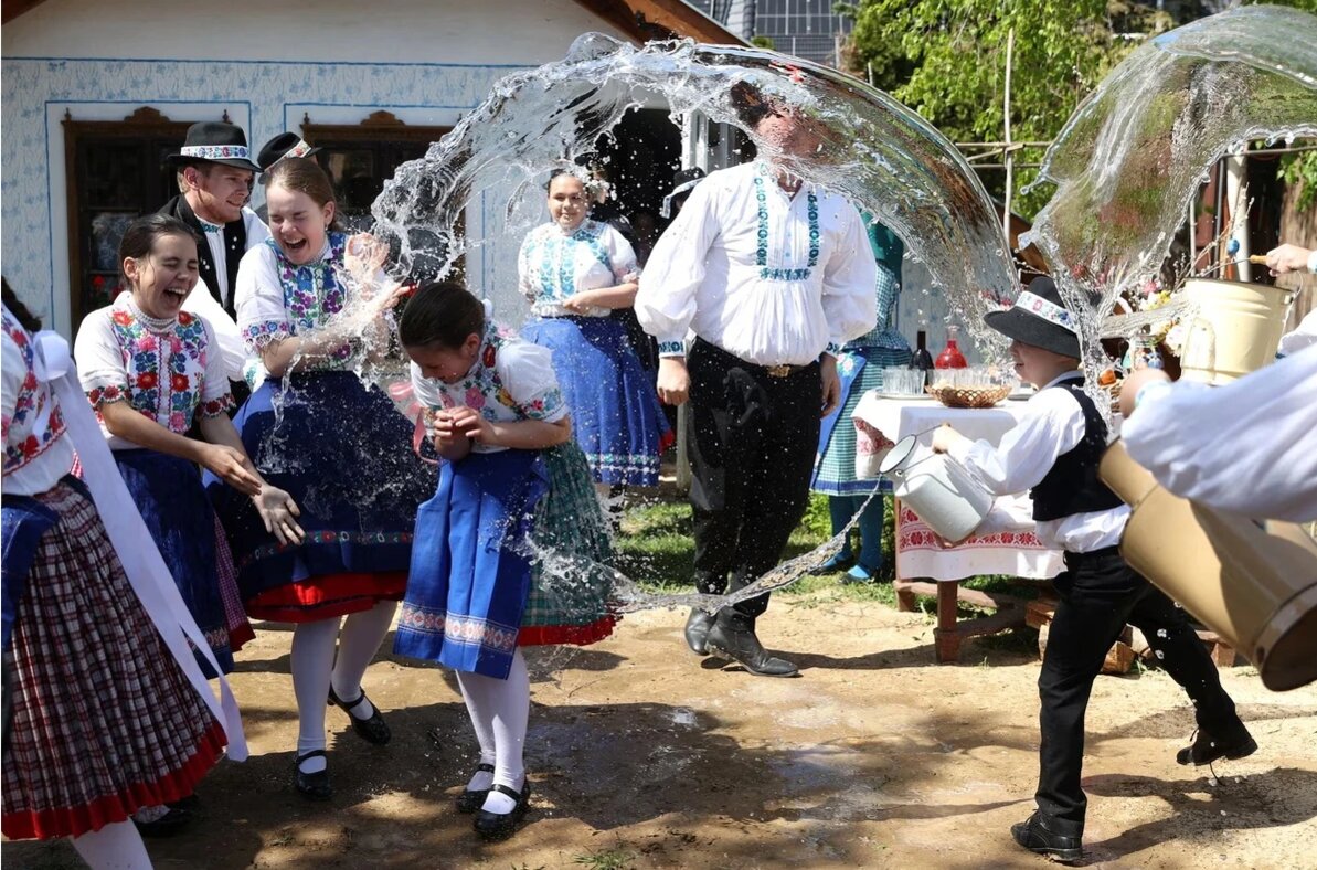 Những thiếu nữ mặc trang phục truyền thống, bị hất nước trong lễ Phục sinh truyền thống ở Csomor, Hungary, ngày 21/4.