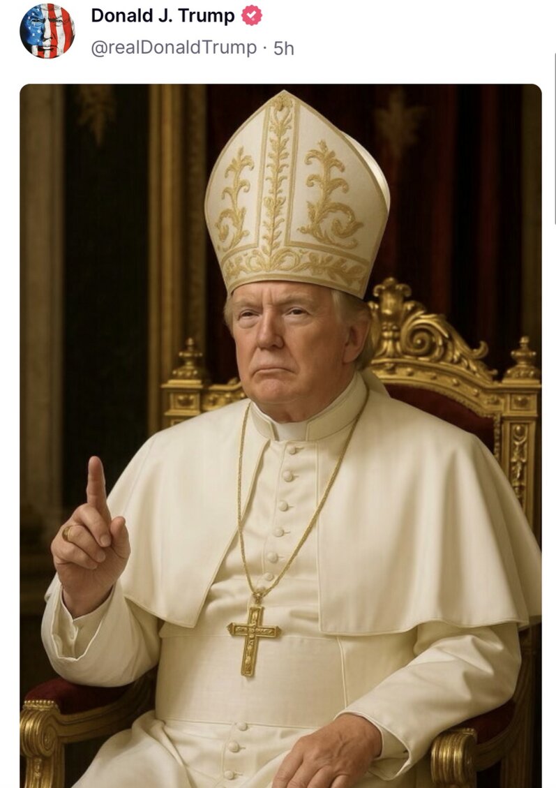 Theo Hãng tin AFP, bức ảnh, dường như được tạo bằng AI, cho thấy Tổng thống Donald Trump mặc trang phục của Giáo hoàng, đeo dây chuyền thánh giá bằng vàng và giơ ngón trỏ tay phải.