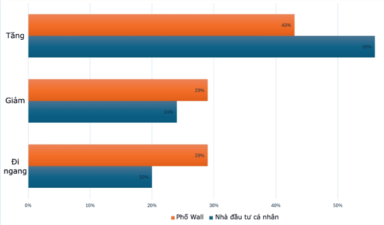 Theo kết quả khảo sát của Kitco, giới phân tích lẫn nhà đầu tư cá nhân đều dự báo giá vàng sẽ khôi phục tuần này. Cụ thể, 6 trên 14 chuyên gia Phố Wall, chiếm 43%, nghĩ rằng giá sẽ tăng. Trong khi, tỷ lệ dự báo giảm và ổn định tương đương nhau, ở mức 29%.