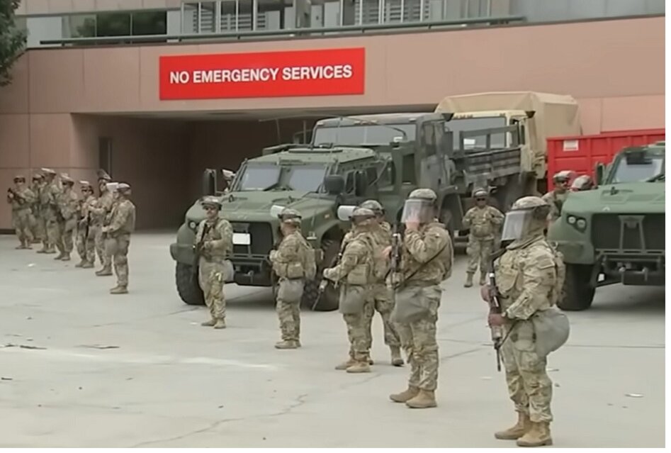 Vệ binh quốc gia bang California có mặt ở thành phố Los Angeles hôm 8/6. Ảnh: ABC7 Los Angeles