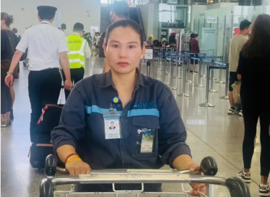 Chị Nguyễn Thị Tâm, nhân viên Đội xe đẩy sân bay Nội Bài nhặt được số tiền khách để quên. Ảnh: N.HÀ