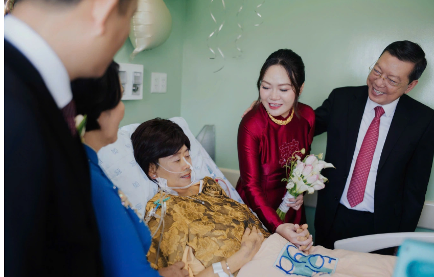 Không phải sảnh tiệc lộng lẫy - mà ngay tại phòng bệnh - người mẹ đang chống chọi với tử thần xúc động chứng kiến khoảnh khắc thiêng liêng khi con trở thành cô dâu.