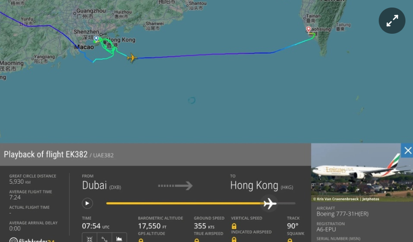 Ngày hôm sau 15/7, hãng bay đã vận hành một chuyến bay khác từ Cao Hùng tới Hong Kong với số hiệu UAE382D.