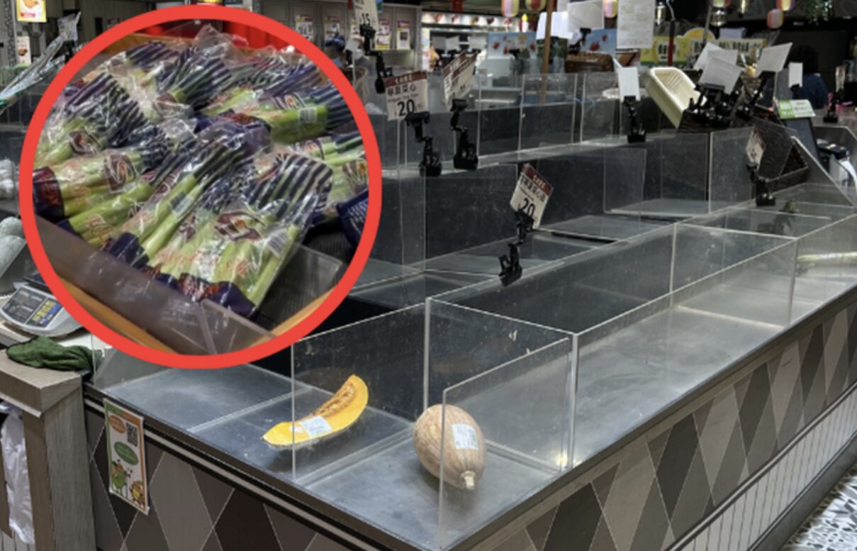 Clip, hình ảnh các gian hàng hệt sạch đồ ăn, chỉ còn 1-2 món đồ được chia sẻ trên khắp các nền tảng mạng xã hội. Thị trường chứng kiến "cơn sốt mua sắm" chưa từng có, rau củ và các loại thực phẩm khác trên kệ hàng của nhiều siêu thị và cửa hàng tiện lợi như Aeon Mall đã cháy hàng. Nhưng cùng lúc này nhiều người cũng chia sẻ hình ảnh một loại rau gần như vẫn con nguyên, không ai mua.
