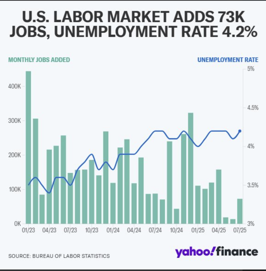 Dữ liệu gây sốc nhất tuần qua đến từ báo cáo việc làm tháng 7, hé lộ rơ nét nhất sự rạn nứt của thị trường lao động. Nền kinh tế Mỹ chỉ tạo thêm 73.000 việc làm, thấp hơn nhiều so với dự báo 104.000. Đáng chú ư hơn là việc dữ liệu tháng 5 và 6 bị điều chỉnh giảm mạnh, tổng cộng giảm 258.000 việc làm. Đây là mức điều chỉnh hai tháng lớn nhất kể từ tháng 5/2020.