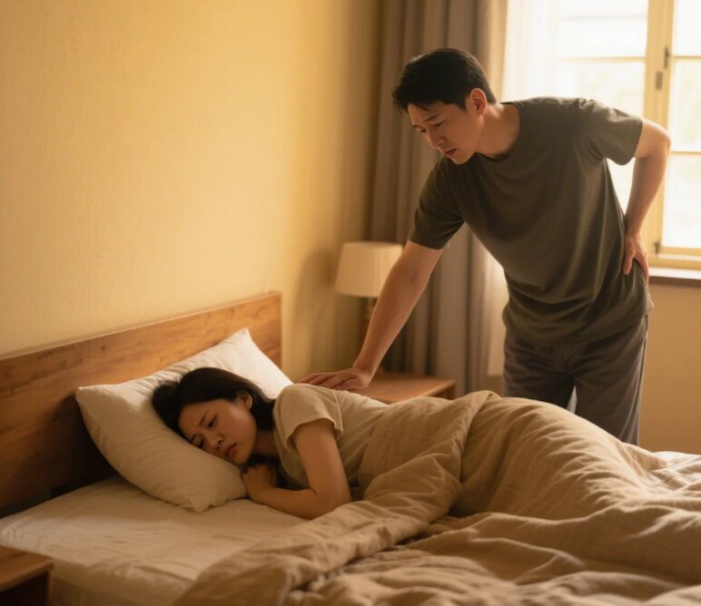 Hai vợ chồng cãi nhau, vợ giận nằm quay mặt vào gối, không nói một lời. Chồng đi uống rượu, nửa đêm về thấy vợ nằm im, đầu vùi trong gối. Anh chồng xúc động, nhẹ nhàng chui vào chăn, xoa lưng vợ và nói: