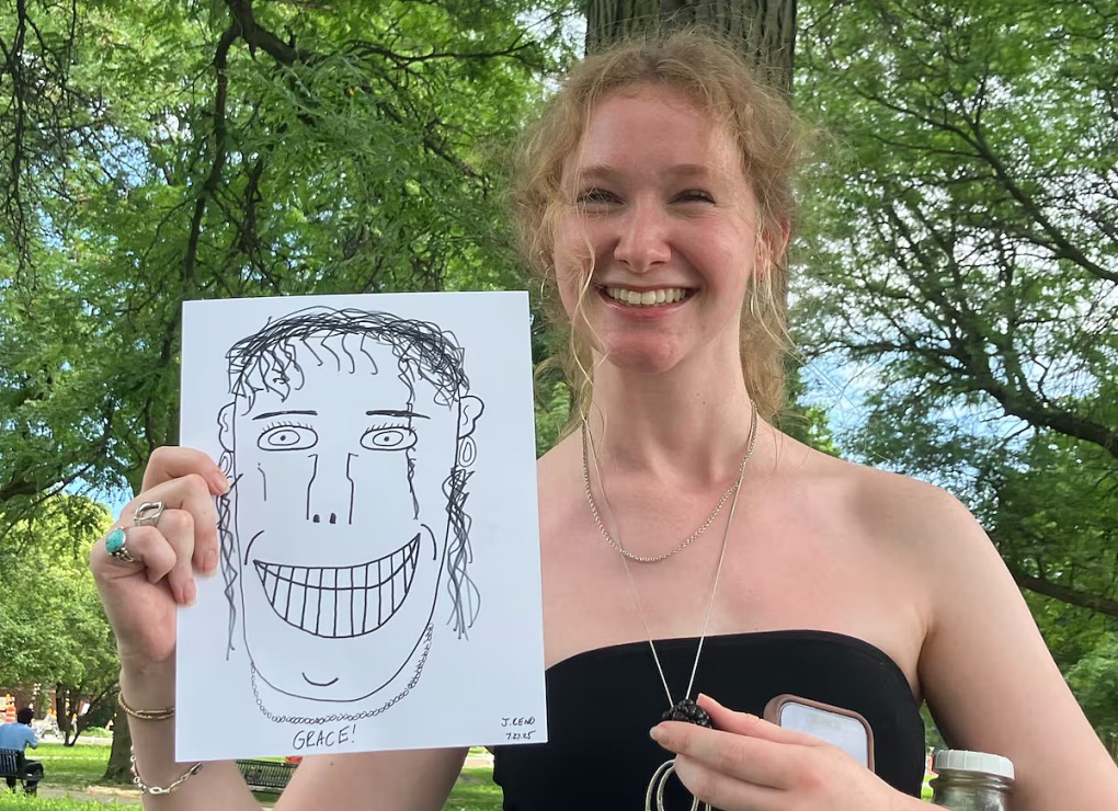 Mặc áo khoác họa sĩ màu xanh đậm, anh mở nhạc jazz, ngồi sau một chiếc bàn gấp, bên cạnh là tấm biển ghi: "Vẽ chân dung xấu hoắc và 5 phút tồi tệ, giá 5 USD".