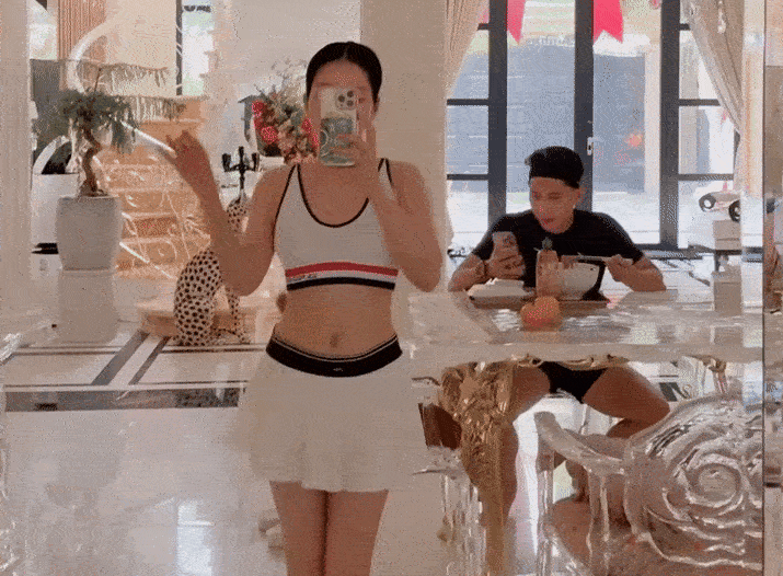 Lệ Quyên khoe dáng trước gương, phía sau là bạn trai Lâm Bảo Châu.