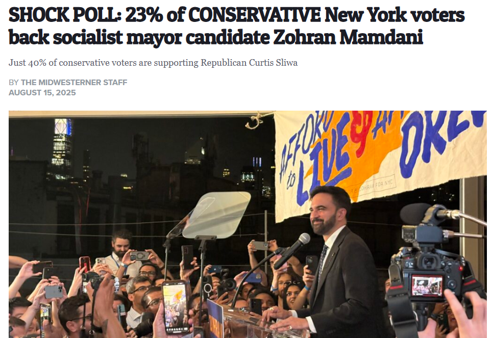 Một cuộc thăm dò gây sốc do Viện Nghiên cứu Siena công bố tuần này cho thấy 23% cử tri tự nhận là bảo thủ dự định ủng hộ ứng cử viên xã hội chủ nghĩa Zohran Mamdani, người đang tranh cử với tư cách là đảng viên Dân chủ. Ngày bầu cử là ngày 4 tháng 11.