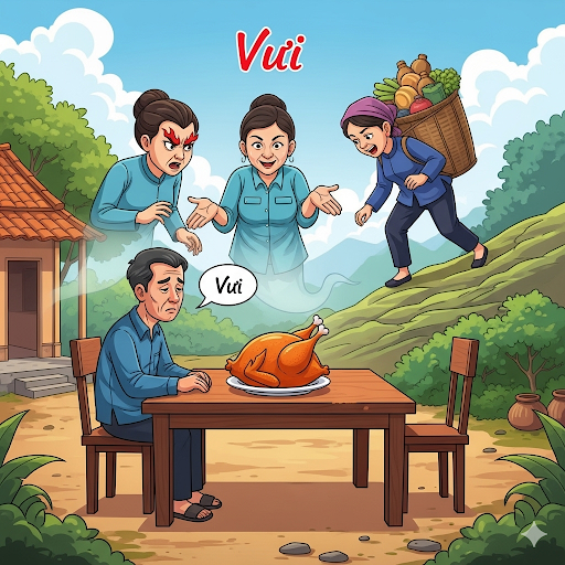 – Ngày trước làm thịt con gà thì hai vợ chồng cùng ăn, giờ em chết rồi, anh ăn một mình... Vui ơi là Vui!