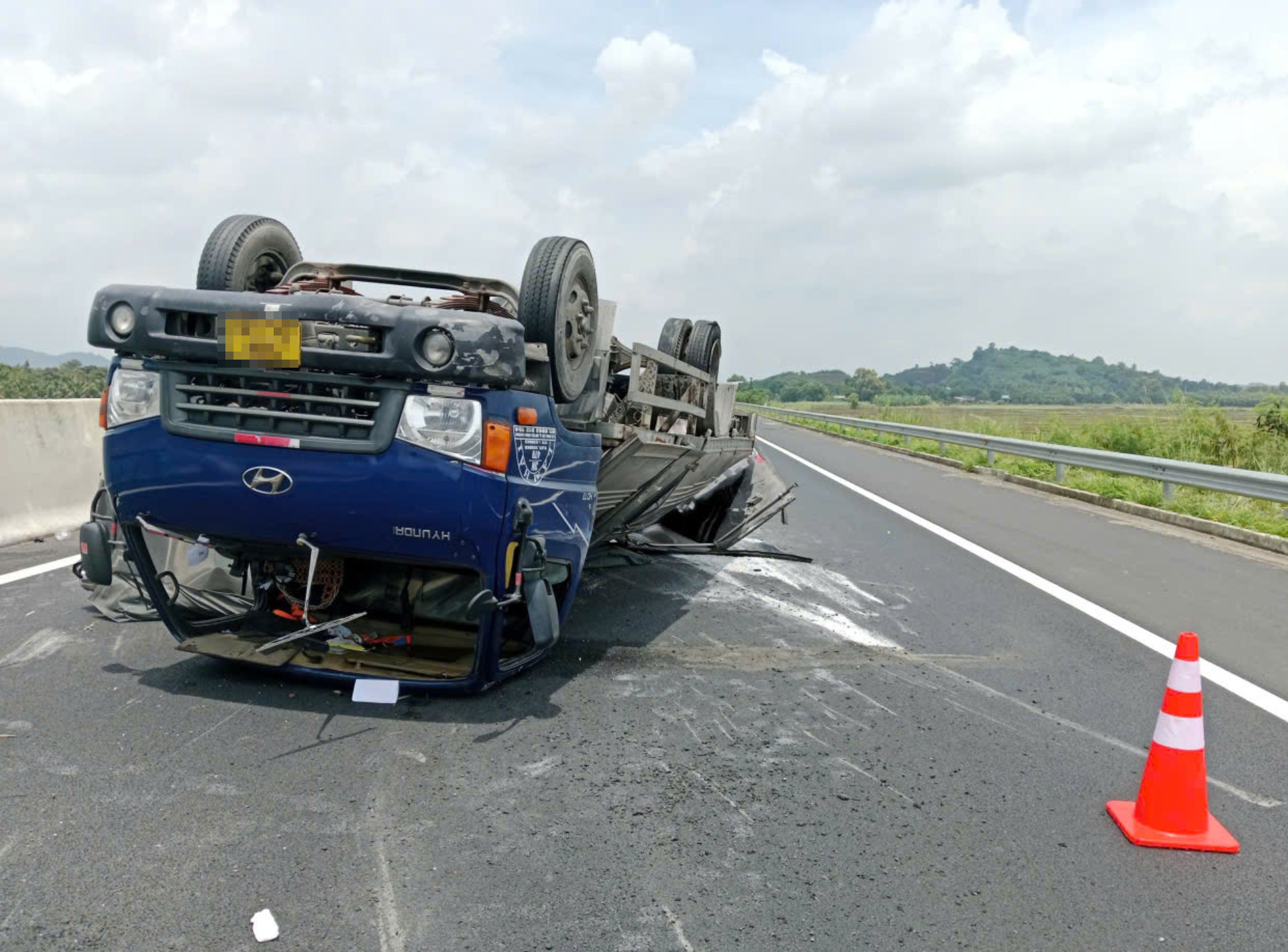 Trưa 6/9, xe tải lưu thông trên cao tốc Phan Thiết - Dầu Giây bất ngờ bị nổ lốp rồi lật ngửa, chắn ngang cả 2 làn đường, giao thông qua khu vực gặp nhiều khó khăn.