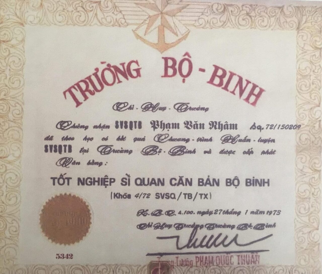 Giấy chứng nhận tốt nghiệp khóa SVSQTB/Trường Bộ Binh Thủ Đức do Trung Tướng Phạm Quốc Thuần ký ngày 27 tháng Giêng, 1973. (Hình: tác giả cung cấp)
