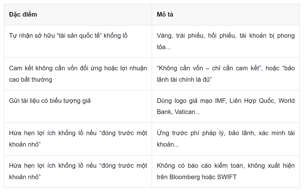 Dấu hiệu lừa đảo dễ thấy là: Không có xác minh tài sản qua ngân hàng quốc tế. Không có tên tuổi trong hệ thống tài chính toàn cầu (Bloomberg, SWIFT, IMF...). Dùng cụm từ mơ hồ: “quỹ phong tỏa thời chiến”, “tài sản ký gửi quốc tế”, “quỹ vàng cũ của Vatican”...