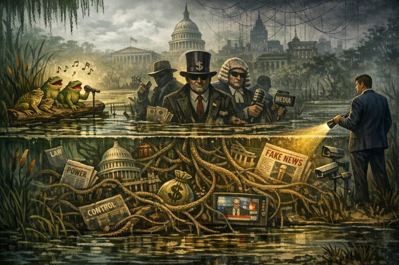 Đầm lầy không chỉ nằm ở tầng cao quyền lực, mà len lỏi vào từng mắt xích của bộ máy hành pháp, lập pháp, tư pháp, và đặc biệt là truyền thông. Những mắt xích ấy móc nối với nhau thành một mạng lưới chằng chịt, che chắn và bảo vệ cho nhau. Nó tạo thành một bức tường vô hình mà bất kỳ ai muốn thay đổi hệ thống đều phải va đầu vào, nhẹ thì sứt trán, nặng thì thân bại danh liệt, thậm chí mất mạng.