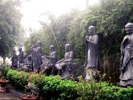Ngay bên cạnh tòa bảo tháp cao 13 tầng là hình ảnh 18 pho tượng La Hán ngồi thẳng hàng, từng nét tượng đều sinh động và rõ nét. Mỗi khuôn mặt của La Hán đều thể hiện đầy đủ sắc thái, cảm xúc khác nhau về những nỗi đau, sự khổ ải đè nặng lên kiếp sống hàng ngày của chúng sinh đang trầm luân trong cõi luân hồi sinh tử. Những pho tượng này được kiến trúc theo dáng mẫu của các vị La Hán chùa Tây Phương (Hà Nội) và đó cũng chính là những vị Đại Đệ tử Phật qua các đời, theo sự truyền đăng của Thiền Tông.