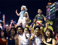 Tại TP HCM, càng gần đến giây phút chuyển giao sang năm mới, ḍng người đổ về trung tâm thành phố càng đông. Mặc dù di chuyển khó khăn nhưng gương mặt ai cũng rạng rỡ, tươi vui. Trên đường Lư Tự Trọng (quận 1), một cú va chạm xe máy khiến những người ngồi trên xe ngă nhào, nhưng họ vui vẻ, tươi cười bắt tay bỏ qua.