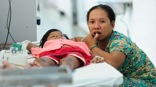 | Một bệnh nhi phải nằm truyền dịch ở hành lang khoa nhiễm Bệnh viện Nhi Đồng 1, TP.HCM - Ảnh: Thuận Thắng |