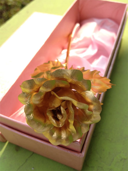 "Anh ấy nói là mong sao t́nh yêu của chúng em sẽ bền chặt, “có giá” như bông hồng này. Khi ấy em rất bất ngờ, v́ em có nghe nói là đang có phong trào tặng nhau hoa hồng dát vàng, giá rất đắt, tuy nhiên em chưa bao giờ nghĩ là lại có người con trai tặng cho ḿnh món quà ấy.
