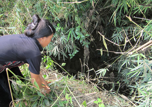 Người dân bản chỉ miệng hang cá thần lâu ngày đã bị cây cỏ phủ kín