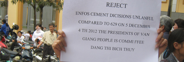 Bà con khiếu kiện mang theo biểu ngữ, băng rôn biểu tình, khiếu nại. Rất nhiều biểu ngữ, cả bằng tiếng Anh . Courtesy blog Nguyenxuandien