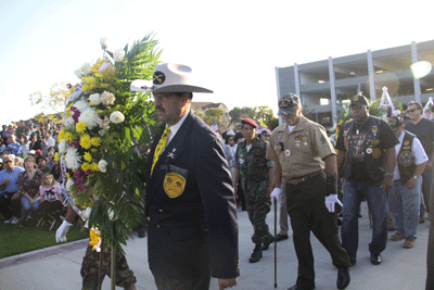 Cựu quân nhân người Mỹ từng tham chiến tại Việt Nam mang vòng hoa đến dự lễ tưởng niệm tại Tượng Ðài Chiến Sĩ Việt-Mỹ, Westminster, hôm Thứ Bảy.