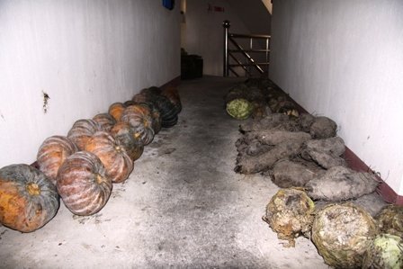 Bí ngô anh xếp nghiêng, dựa vào tường, quả to gấp ba cái giành tích, và vẫn còn nguyên cuống. Bắp cải xếp chiếc một trên mặt đất, tất cả bắp cải đã úa hết lớp lá ngoài cùng. May vì nền nhà khô ráo, nếu không, nó đã bị thối rữa rất nhanh sau đó…