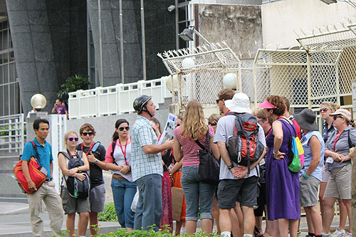 Sáng ngày 19/6, trong sân Bảo tàng Chứng tích chiến tranh, một đoàn khách nước ngoài hơn 40 người đứng vây quanh chăm chú lắng nghe một người đàn ông “tóc vàng mắt xanh” thuyết minh bằng tiếng Anh. Đi kèm với HDV ngoại còn có một thanh niên Việt nam mặc áo xanh, là HDV người Việt đóng vai trò “bình phong” cho HDV ngoại, sẽ trình thẻ HDV nếu bị kiểm tra. Phần lớn công việc từ quan trọng nhất là thuyết minh, hướng dẫn đoàn cho tới tìm kiếm phương tiện di chuyển, tập trung đoàn… đều do HDV ngoại đảm trách. Anh này có thể giao tiếp bằng tiếng Việt, thậm chí còn đùa giỡn thân mật với người bán sách dạo trong khuôn viên bảo tàng, chứng tỏ đã nhiều lần đưa khách đến đây.