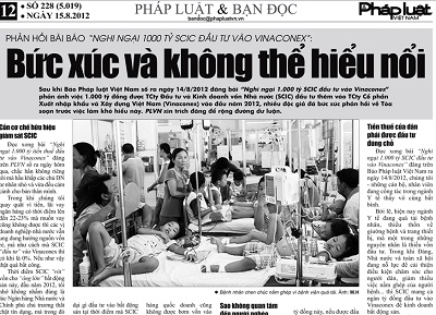 Hiệu quả đầu tư bằng nguồn vốn nhà nước đang là câu hỏi nhức nhối mà bạn đọc tiếp tục đặt ra sau khi Báo Pháp luật Việt Nam đăng tải bài viết “Nghi ngại 1.000 tỷ SCIC đầu tư vào Vinaconex”.