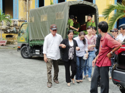 Mẹ bị cáo Hiếu được người thân dìu bước ở sân tòa