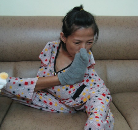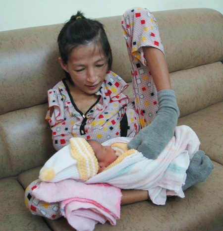 Nỗi đau nhất của người mẹ trẻ Lâm Thị Hồng Nhung (23 tuổi, ngụ huyện Gò Quao, tỉnh Kiên Giang) là không thể bồng trên tay đứa con của mình như những người mẹ bình thường khác. Bởi em không có hai tay và việc đi đứng của em cũng đã là quá khó khăn. Chứng kiến hình ảnh em Nhung ôm con bằng hai chân khiến chúng tôi rơi nước mắt.