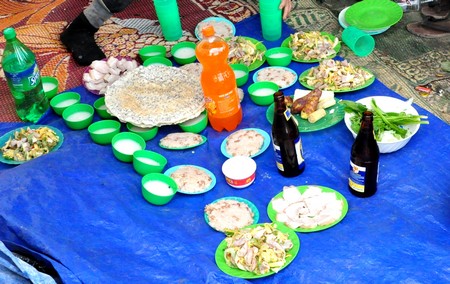 Đợi cho tàn nhang, họ mang tất cả những thứ vừa cúng bày ra và mời những người khác chung vui. Bàn tiệc đơn sơ giữa bãi rác khổng lồ nhưng hơn 10 con người cùng quây quần ăn uống vui vẻ.