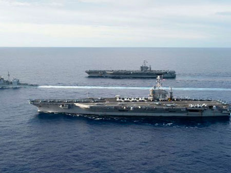 Hai tàu sân bay Mỹ USS John C. Stennis và USS George Washington trong một cuộc tập trận gần đảo Guam (Mỹ). Ảnh: Hải quân Mỹ