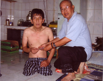 Ông Dương Quang Lạc đến thăm và trao quà cho TB Nguyễn Văn Phúc ở quận 1 Saigon. (H́nh: DLF cung cấp)