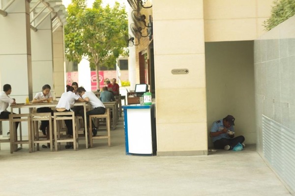 Bức ảnh ghi lại hình ảnh một bác bảo vệ với làn da sạm nắng ngồi ăn bữa cơm đạm bạc dưới đất, phía sau một bức tường dày của quán, phía bên kia có nhiều bạn trẻ mặc áo trắng đồng phục đang ngồi uống cafe ở "ghế cao" sang trọng. Sự tương phản này có lẽ chính là nguyên nhân khiến bức ảnh này dù chỉ mới được up lên facebook chưa lâu nhưng đã có hàng ngàn lượt like, hàng trăm comment và chia sẻ.