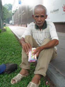 Trước đây, dù Sài Gòn nắng như đổ lửa hay mưa như trút nước thì ngày ngày ông Phúc vẫn cầm xấp vé số khập khiễng lê từng bước trên khắp các con hẻm lớn, nhỏ trong nội thành. Vừa đi, ông vừa ho sùng sục như muốn vỡ lồng ngực. Nhưng gần 1 năm nay, do sức khỏe đã quá yếu kém, ông Phúc đành phải cam chịu luẩn quẩn ở ngã tư đường Hai Bà Trưng-Lê Duẩn (quận 1), đứng cầm vé số chào mời khách đi đường. Ngày nào may mắn lắm, ông Phúc cũng chỉ bán được vài chục tờ, do đó cuộc sống gia đình của ông luôn trong cảnh lao đao.