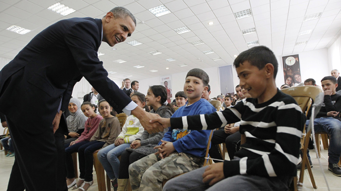 Tổng thống Mỹ Obama tạo hình ảnh thiện cảm ở Palestine khi đi thăm Trung tâm thanh thiếu niên Al Bireh ở Ramallah ngày 21-3 - Ảnh: Reuters