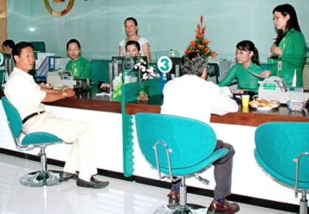 Đi tiên phong trong việc giảm lãi suất huy động trong nhóm ngân hàng thương mại có lẽ là ngân hàng TMCP Ngoại thương Việt Nam (Vietcombank). Chỉ trong vòng chưa đầy 1 tháng, ngân hàng này đã 2 lần điều chỉnh giảm lãi suất huy động VNĐ. Sau đợt điều chỉnh vào ngày 16/4, Vietcombank tiếp tục giảm lãi suất huy động VNĐ từ ngày 6/5 với mức lãi suất thấp nhất là 6% cho kỳ hạn 1 tháng, 2 tháng là 6,5%, 3 tháng là 6,8%. Tuy nhiên, giao dịch của các chi nhánh ngân hàng này ở TPHCM ngày 10/5 vẫn rất bình thường.