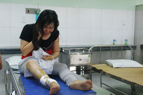 Một nạn nhân bị găy chân đang điều trị - Ảnh: Hoàng Sơn Anh Din cho biết khoảng 20 phút sau khi xảy ra vụ tai nạn, người dân đă tiếp cận với anh để giúp đỡ nhưng cũng bó tay cho đến khi một chiếc xe cẩu được điều đến hiện trường và đưa anh ra ngoài.