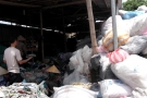 Trong xưởng, công nhân ngồi bệt trên nền đất, tay không bảo hộ tách hàng đống bao tải chứa “nhựa tổng hợp” từ bao bì nilong, các hộp nhựa, xốp đựng thực phẩm, nồi niêu, xô chậu nhựa… được dân ve chai thu gom về.