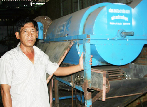 Anh Nguyễn Văn Hai bên chiếc máy tuốt củ lạc - Ảnh: Quế Hà
